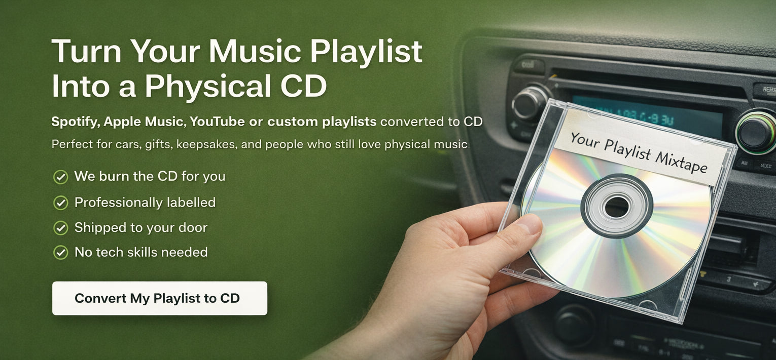 Turn your Spotify or Apple Music playlist into a CD, USB, or downloadable digital files.